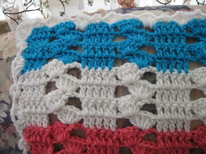 - (4 rows grenadine, 4 rows white, 4 rows parakeet) 5 times
