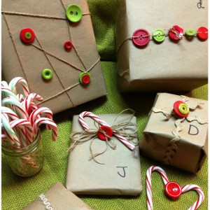 - After you wrap the gifts, gather two colors of buttons for the holidays, red and green. Glue the buttons on first and then wrap the twine around them.