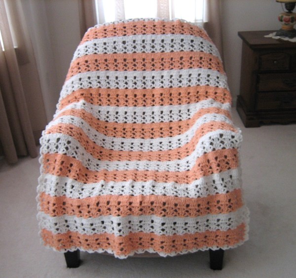 This lovely Bands of Lace Afghan is perfect for year-round comfort. Alternating bands of tangerine and white make this blanket a wonderful choice for adding a little pop of color to your home decor. This crocheted afghan is also quite lacy, making it a nice blanket for those cooler spring and summer evenings. Easy enough for crochet fans of all skill levels, this light and lacy blanket is everything you want in a pattern...simple, beautiful, and colorful.