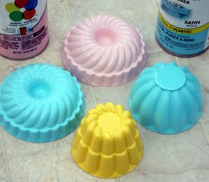 - Once the primer has dried, coat the molds with your colored spray paints. Again, make sure the inner rims have a coat of paint: