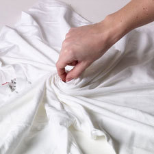 Lay fabric flat on work surface. Decide the area on the fabric where you want the swirl to be. Pinch fabric at this point. Twist fabric around into a flat spiral.