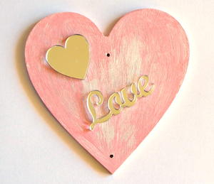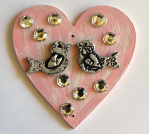 - Hot glue the turtle doves, mirror heart, mirror word and rose to the different hearts.