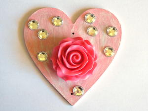 - Add a drop of Super Glue to each flat-sided rhinestone sticker. Glue nine hearts each in random places on two of the hearts.