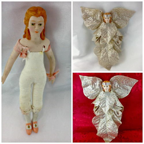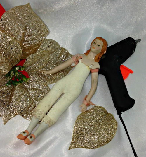"This Poinsettia Angel is very easy to make. I save abandon dolls and make fairies with faux flower petals but since its Christmas I decided to make this one an Angel. When I make these, I transform the doll by adhering the petals directly to them and turning them into the flower versus dressing them in a flower. This Angel was made with gold poinsettia faux flowers from the dollar store and a glue gun."