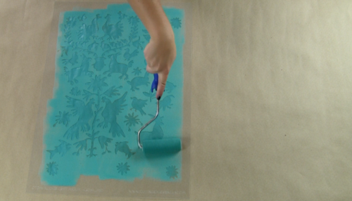 She poured her blue craft paint onto a small paint tray. Then she lightly coated her dense foam roller with paint. Be sure to roll off the excess paint onto your folded paper towel. The key to stenciling is using as little paint as possible. Too much paint will cause the design to bleed and smudge.