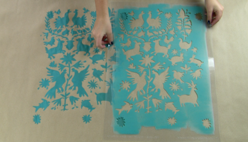 Once the entire design was painted, she lifted the stencil back to reveal the eye-catching Otomi pattern.