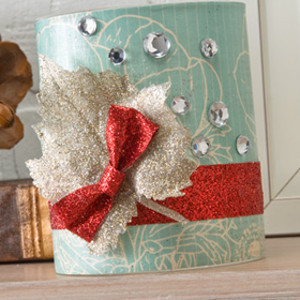 - Hot glue ribbon around the cylinder. Add a leaf and bow detail. Hot glue gems to the cylinder.