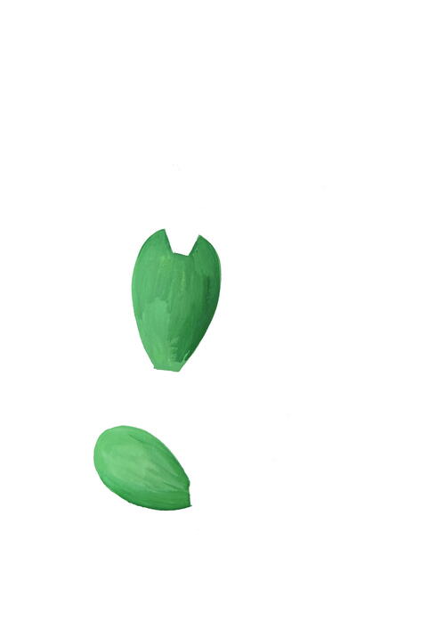 Start with painting the fleshy leaves with colors D and E using a round size 2 brush. These two colors will form the base for all of the leaves. Let’s take two leaves first and begin by painting the base of the leaves with color E. Since we are using the wet-on-wet painting technique, while color E is still wet, take color D and start painting strokes from the left or right of the leaf and let it blend with the base layer toward the center. -