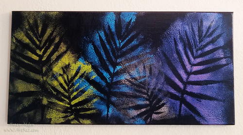 From the Designer: "This quick and easy stencil art will make your home ready for warmer months, using common house plant palm fronds. Using bright and cheerful FolkArt Color Shift Paints, this selection of paints is reminiscent of Summer nights of a tropical vacation. Create this project in an evening. Supplies: FolkArt Color Shift Paints in Yellow Flash, Green Flash, Aqua Flash, Blue Violet Flash and Pink Flash, 10×20 Canvas, Paint Brush, Acrylic Paint in Black, Mini Paint Roller, Plastic Salad Lid, Gloss Varnish, Palm Fronds or other fresh plant trimmings."