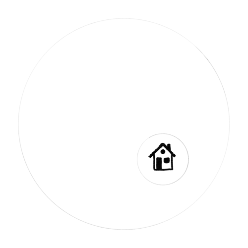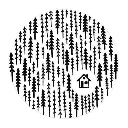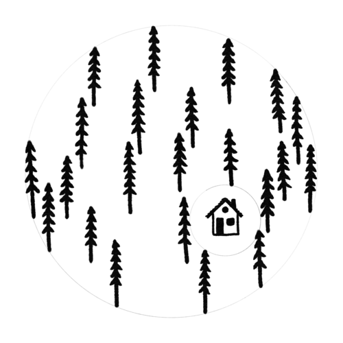 Inside the smaller circle, place a small cabin in a medium (05) and a thin (01) pen. You can do that with the level of detail that looks good to you. I kept it fairly simple with a door, two windows, a chimney and some tiny shingles on the roof outline.
