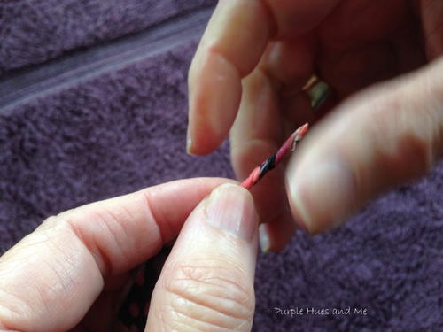 Fold the dampened napkin strip in half, lengthwise with the pattern facing out and begin twisting the strip between forefingers and thumbs until entire length is twisted. Repeat for all of the cut strips.