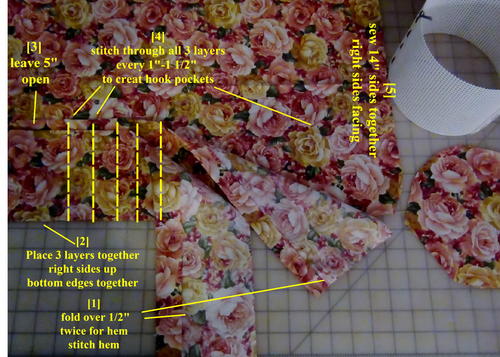 To create pockets: Measure 5” from side edge to create largest pocket, sew seam every 1 1/2” to creat crochet hook pockets [see photo].