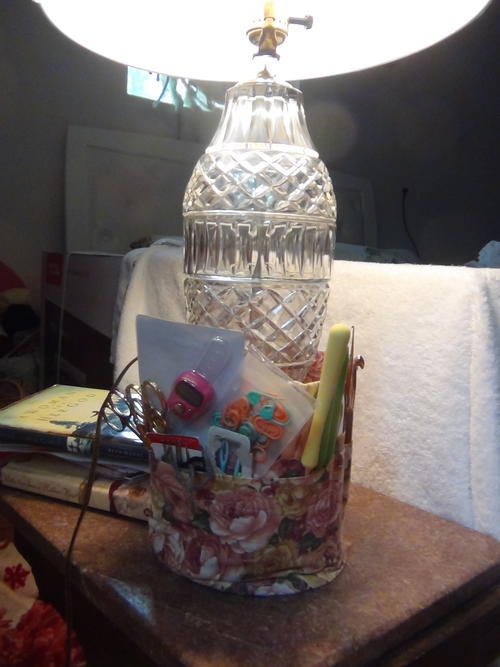 Someone really had their thinking cap on to come up with this one. I never would have thought of wrapping it around the lamp. It would be out of the way yet close at hand. And very easy to see what you are reaching for. This is a unique and fabulous idea.