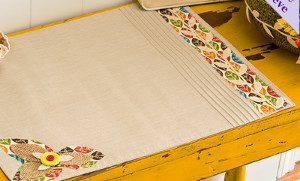 - Cut a fall leaf shape from the fabrics. Apply a thin coat of Mod Podge Fabric to the back of the leaves. Working on the corner of the placemat, glue the leaves to the corner. Tear a strip of fabric to fit the side edge of the placemat, attach with Mod Podge Fabric.