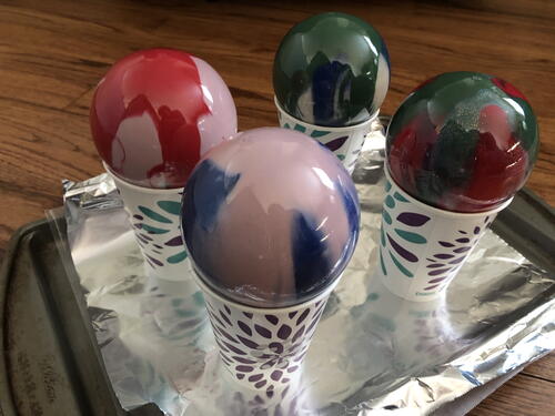 Next, place the ball upside down in a paper cup so the excess paint can drip out and coat sections of the ornament that were not initially covered with the paint. This will enable the paint to dry quicker inside of the ornament and to enhance the tie-dye look of it.