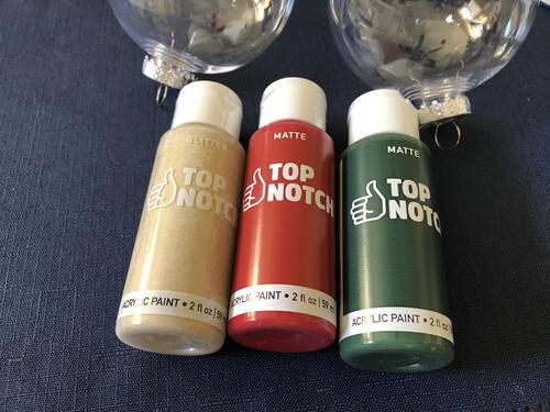 To start, carefully remove the top of the ornament and squeeze the paint directly from the bottle into the ornament. You want to hold the ornaments on an angle while squeezing in the paint so that it drips down the sides of the ornament as opposed to just pooling at the bottom of it.