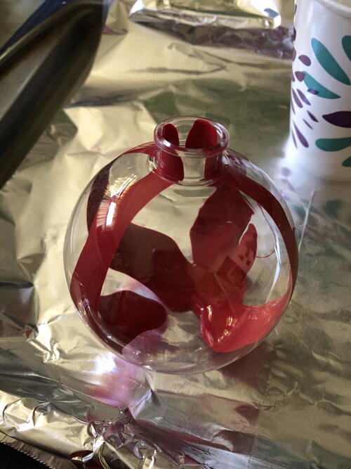 Squeeze your other colors into the ornament. Wait a minute or so so the colors can fully drip down the sides of the ornament. It’s okay for the paint to pool at the bottom after it has coated the sides of the ornament.