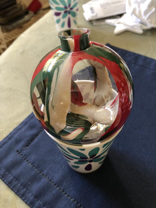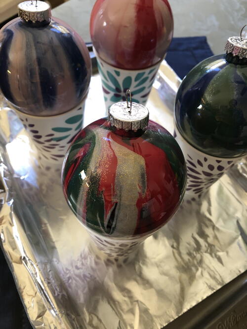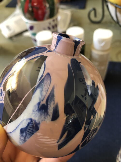 After a few hours all the excess paint should have dripped out and you will be able to replace the top of the ornament and use ribbon, twine or an ornament hook to hang it on your tree or give as a gift.