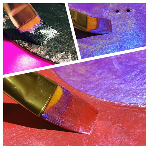 Using a brush, paint center of plate with Plaid Color Shift Purple Flash; then outer ring with Plaid Color Shift Red Flash. When Dry, apply Plaid Color Shift Black Flash to backside of plate. Add second coat of Red and Purple Paint. Paint/touch up edges using a cotton swab. Set aside to dry.