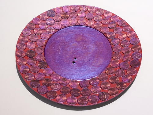 From the Designer: "Find a penny, pick it up... and all the day you'll have good luck! So what does one do with all those pennies? Make some fun and whimsical wall decor of course! LUCKY for me that I happened to have a papier-mâché craft plate in my stash just waiting for it's turn to be transformed. Using a Xyron sticker maker, I have collaged a dollar or two from my LUCKY penny stash onto the plate – all painted with shimmery paints and my favorite color... PURPLE!"