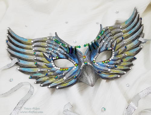 From the Designer: "Create a sparkling fantasy masquerade mask with Testors Craft Intense Glitter paint and a simple .99 cent store Halloween mask! Any number of rhinestones, ribbons and paint can be used to create a mask that is one-of-kind. Time needed to create this is piece is two evenings, only because of dry time needed for the paints. Supplies: Testors Craft Intense Glitter Paint, Plastic Owl Mask from a .99 cent store, Multi Surface Acrylic Paint in Grey and Black, Metallic Multi Surface Acrylic Paint in Blue and Green, 2 Paint Brushes, Beacon Gem-Tac Glue, Swarovski Rhinestones Flatback Vitrail Medium SS20, Clear Crystal Rhinestone Flatback 4mm and 3mm, Crayon, Silver Ribbon,"