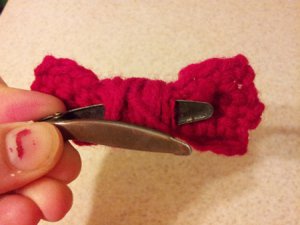 - To assemble, fold bow in half hot dog wise and wrap yarn around the middle of the bow. Tie off to secure.