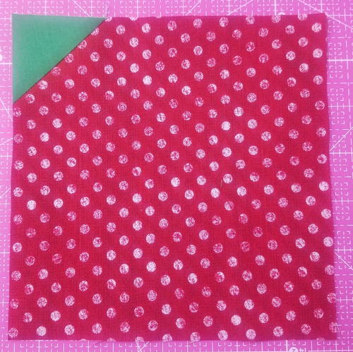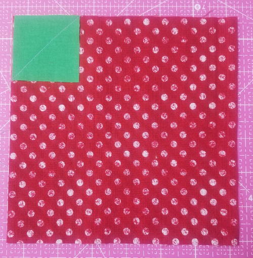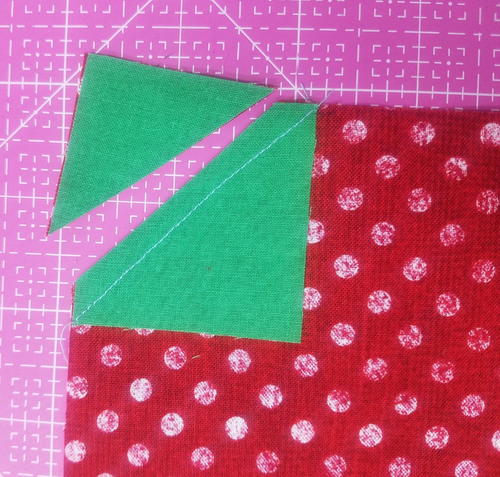 Mark the wrong side of a green 2″ square in half diagonally once. Lay in the corner, right sides together, of a red 6 3/4″ square. Sew on the marked line.