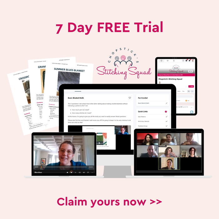 The Chopstick's Stitching Squad membership will help knitters and crocheters gain the inspiration, confidence and skills to turn their creativity into beautiful creations while broadening their crafting horizon by teaching them knitting and crochet techniques, as well as my practical know-how and experience, providing patterns and a tight-knit community of worldwide crafting friends to cheer you on.