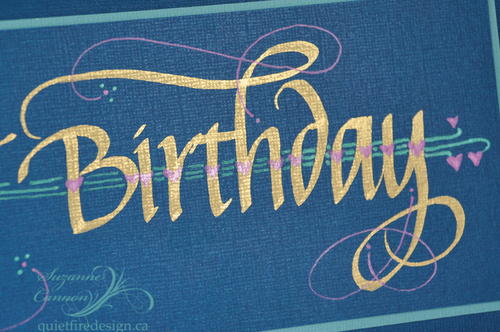 In the Designer's Words: "Lettering in gold and adding a few easy strokes and embellishments can make all the difference to personalizing your card. When these letters catch the light, they simply glow! Draw little curls at the end of the phrase. Add extra flourishes, hearts and dots. Have fun!"