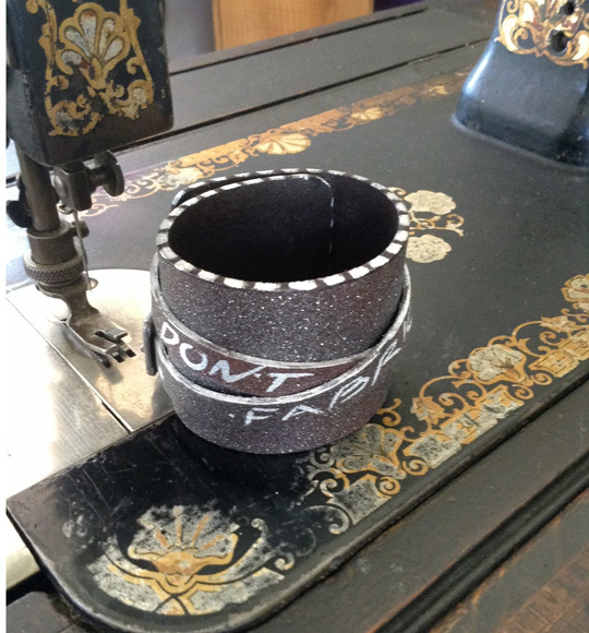 - Add a "stitched" look on the edges of the cuff with the Krylon Silver Leafing Pen by drawing dashes. Outline the holes on the cuff with the Krylon Silver Leafing Pen to create a faux grommet look.