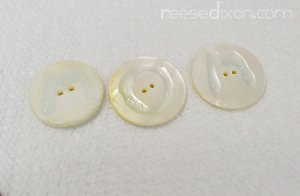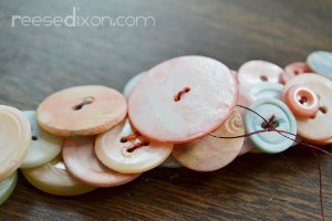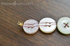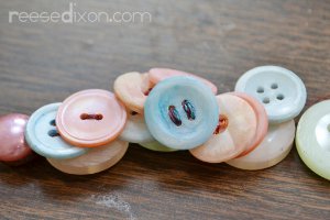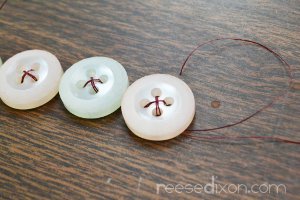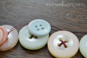 - Line up your largest buttons until you have a line long enough to fit around your wrist. Bring your threaded needle up from the back and through each hole, making an X, then move on to the next button with the thread in the back and repeat until your buttons are all sewed together.