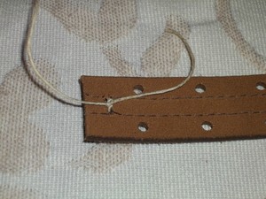 - Measure down 1/4 inch from the center of one end on the cuff strip. Using a leather hole punch, punch two holes at this center measurement, spaced 1/4 inch apart. Repeat on the other end of the leather cuff strip.
