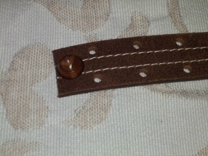 - Insert the ends of one hemp cord through the button holes of a 1/2-inch button with two holes, with the ends on the back of the button. Inset the cord ends through the punched holes on one end of the cuff strip, from the front to the back. Bring the ends together on the back of the strip and tie in a knot. Cut off the excess on the ends of the knot. Apply a dot of craft glue over the knot to prevent it from coming undone.