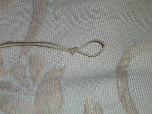 - Fold the remaining cord in half. Tie an overhand knot 1 inch from the folded end. This will create a loop. Insert the ends of the tied cord through the holes on the other end of the cuff strip, from the front to the back. Bring the ends together on the back of the strip and tie in a knot. Cut off the excess on the ends of the knot. Apply a dot of craft glue over the knot to prevent it from coming undone.
