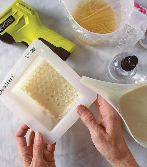 Substitution: If you don’t have access to honey base for this project, make your own by combining 2.5 ounces (71 g) of clear soap base with 1⁄4 teaspoon of brown sugar and 1⁄8 teaspoon of honey. Stir and check the color. If needed, add a little more brown sugar for a darker color, but be careful not to add too much or it could become sticky.