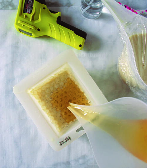 Cool the melted honey soap base to around 135°F (57°C) and pour it into the mold, over the bubble wrap. Spritz the top of the soap with alcohol and let it cool for 10 minutes. Spray the top of the soap in the mold with alcohol and fill it with the remaining goat’s milk base, reheating the base to 135°F (57°C), if necessary.