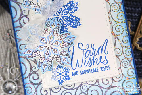 Stamp medium and large snowflakes onto Foil-Mates Detail Sheet using Powder Blue ink, stamping over coordinating toner-printed designs; die cut snowflakes with corresponding dies. Foil snowflakes with Sparkling Silver foil, placing snowflakes on scrap piece of cardstock inside folded parchment paper before inserting into laminator. Blend inks around snowflake edges.