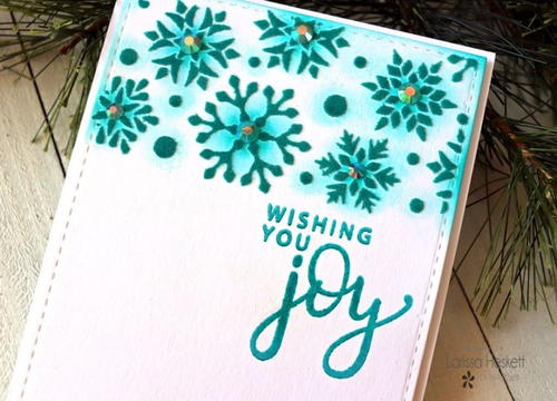 I Stamped and Embossed the sentiment from the Gina K Designs Wishing You Joy Stamp Set using the Faded Jeans Distress Oxide Ink and WoW Ultra Fine Embossing Powder!! Then I added some Pretty Pink Posh Aquamarine Jewels to the center of the Snowflakes!! I LOVE the Sparkle they add and how they change to match colors of the Snowflakes!!