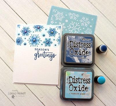 SWOON!! Pulling the Flock backing off to reveal the Flocked Snowflake design is my FAVORITE Part!! I wanted to add even more dimension so I used Distress Oxide Inks in Faded Jeans and an Ink Dauber for the center of the Snowflakes and then added Tumbled Glass with an Ink Dauber to blend out the Faded Jeans!! I LOVE how it really makes the Flocked Snowflakes POP off the Card Panel!!