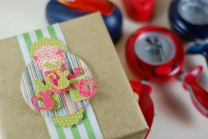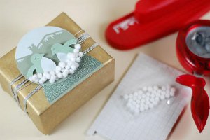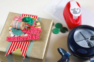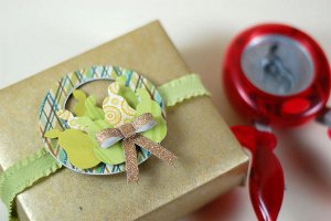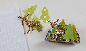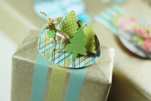 Begin by punching out a XXX-Large circle from a scrap of patterned card stock. Fold your circle in half with the patterned side in. Fold the circle back open to 45 degrees. Use the bottom half as your base to build a little vignette. Use your hot glue gun to attach several punched trees and a little deer or other plastic holiday figurine. Attach to the top of a vertically positioned package using double-stick tape.