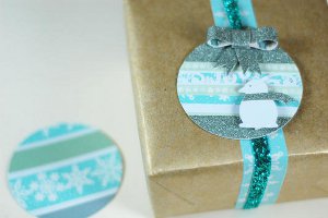 To create this striped ball, take several colors and patterns of washi tape and run rows on a sheet of cardstock. Smooth the tape down, then punch a XXX-Large circle from the taped sheet. Trim your ball with stickers, bows, borders, or punched shapes. Punch a small hole at the top and thread a ribbon through to attach it to a package.