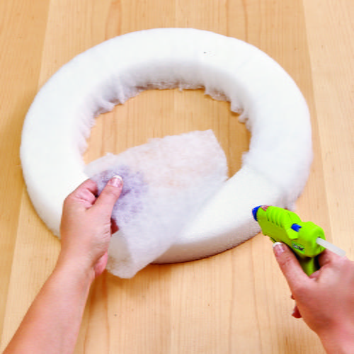 Wrap the batting around the front and sides of the wreath to completely cover. Trim so that the ends meet but do not overlap. Trim the batting even with the back edge of the wreath.