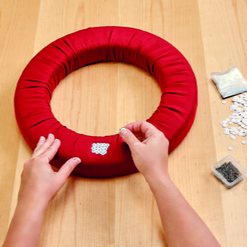 Begin pinning the sequins in place as shown to look like falling snow. Pin the sequins sporadically towards the top of the wreath. Pin them thicker and more condensed as they accumulate at the bottom of the wreath.