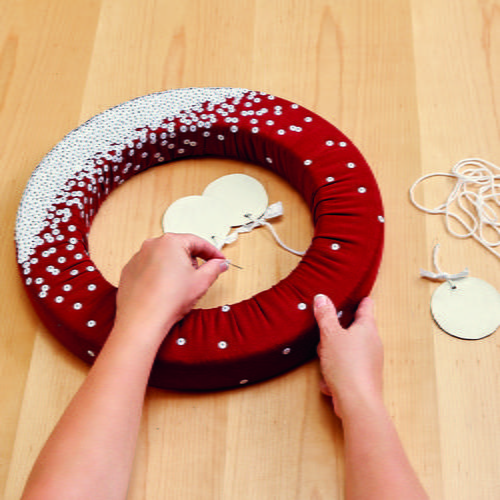 Use a marker or paint pen to write your message on the canvas tags. Tie lengths of yarn to the tags and sequin pin them hanging from the inside of the wreath. Tie lengths of ribbon around the yarn at the top of the tags to embellish.