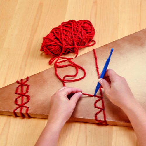 Draw your desired design in pencil on the tree. Draw very lightly so you do not indent lines into the tree. Lay the end of the yarn at the beginning of the design. Use the tuck tool to tuck the end of the yarn into the foam. Do not push the tuck tool in very far or you will create too big of a hole. If the yarn doesn’t stay when you remove the tool, tuck in a little more until it stays. Follow the stitching along the design, tucking the yarn for each stitch. Zigzag stitch the yarn back and forth within a shape to fill in solid with yarn.