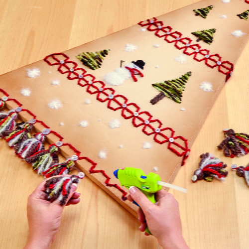 Make a large pompom from all the yarn colors and glue to the top of the tree. Make several small tassels from the yarn and glue them hanging from the bottom of the tree. Embellish the tree with buttons