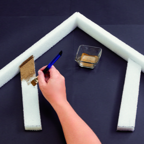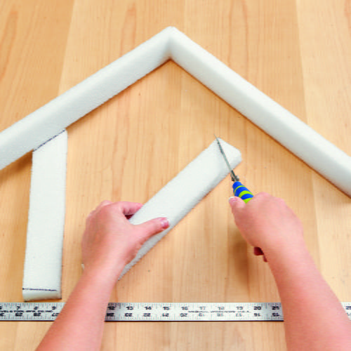 Cut two 2”x18” and two 2”x12” pieces from the 1” foam sheet for the roof and walls. Cut one 4-½”x12” piece from the ½” foam sheet for the base