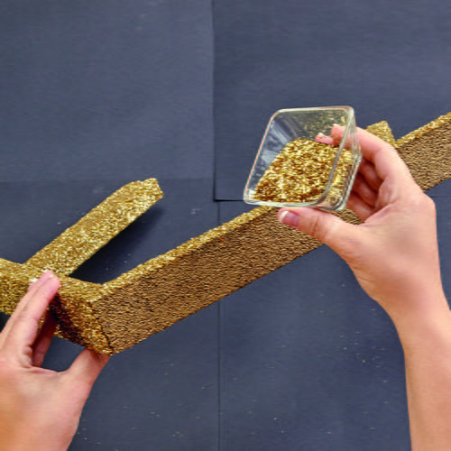 Paint the roof and walls gold. While the paint is still wet sprinkle with gold glitter. The paint will secure the glitter in place as it dries. Once completely dry; spray with a clear sealer to help prevent glitter from flaking off.