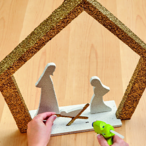 Paint the base and the Joseph, Mary and Baby Jesus silhouettes white. While the paint is still wet sprinkle with iridescent glitter. Paint the craft sticks and the star gold. While the paint is still wet, sprinkle with gold glitter. Let dry completely.