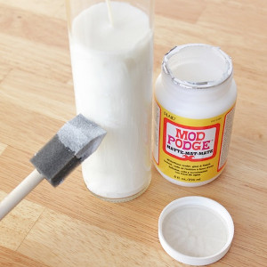 - Paint a generous layer of Mod Podge onto the candle jar.